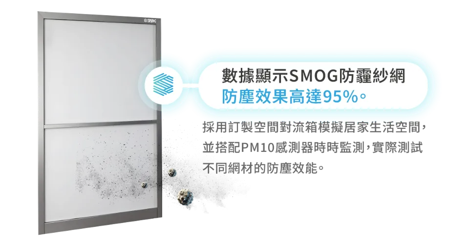 SMOG防霾紗窗運用微靜電技術,結合均衡出色的編織法,使空氣中帶有電子的懸浮粒子,能有效吸附在紗線上,使得室內空氣得到淨化。